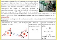 Una rampa es una superficie inclinada que nos permite conectar dos lugares a diferente altura. Hoy en día, todos los edificios públicos deben contar con acceso para el desplazamiento de las personas con movilidad reducida o adultos mayores. La construcción de rampas es obligatoria, siguiendo las especificaciones que indican que su ángulo de inclinación debe tener un rango de 10° a 15° respecto a la horizontal. Actualmente, en el hospital Nueva Esperanza están construyendo una rampa lineal, cuya altura será de 1,5 m al final de ella. Calculamos la longitud de la rampa cuando el ángulo es de 30°: