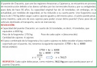 El puente de Chacanto, que une las regiones Amazonas y Cajamarca, se encuentra en proceso de reconstrucción debido a los danos sufridos por las torrenciales lluvias y por su antigüedad, pues data de hace 90 años. Su capacidad original fue de 16 toneladas; sin embargo, en la actualidad, por medidas de seguridad, se ha reducido a su cuarta parte. Una furgoneta cuya tara es de 1750 kg debe cargar cuatro cajones iguales y del mismo peso. ¿Cuánto puede pesar, como máximo, cada uno de esos cajones para poder cruzar dicho puente? (Tara: peso de un vehículo destinado al transporte, vacío sin mercancía).