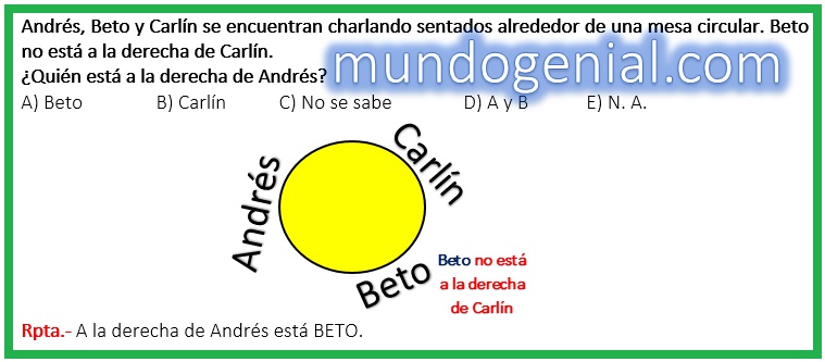 Andrés, Beto y Carlín se encuentran charlando sentados alrededor de una mesa circular. Beto no está a la derecha de Carlín. ¿Quién está a la derecha de Andrés? By admin | 24 septiembre, 2022 0 Comment publicidad