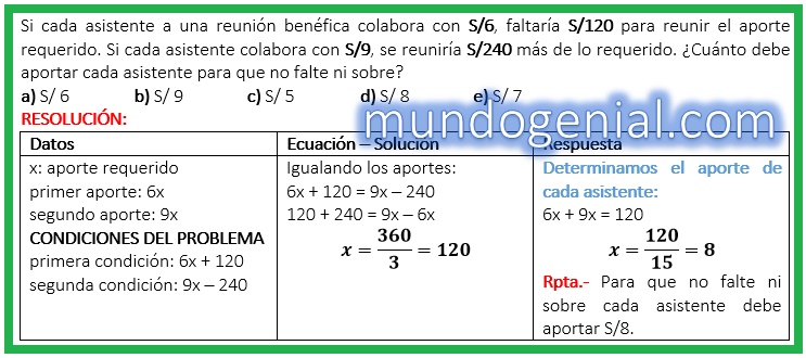 Si cada asistente a una reunión benéfica colabora con S/6, faltaría S/120 para reunir el aporte requerido. Si cada asistente colabora con S/9, se reuniría S/240 más de lo requerido. ¿Cuánto debe aportar cada asistente para que no falte ni sobre? By admin | 14 noviembre, 2022 0 Comment publicidad