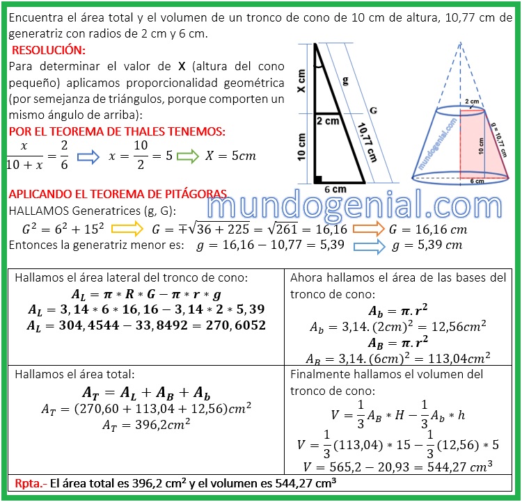 Encuentra el área total y el volumen de un tronco de cono de 10 cm de altura, 10,77 cm de generatriz con radios de 2 cm y 6 cm. By admin | 19 mayo, 2023 0 Comment publicidad