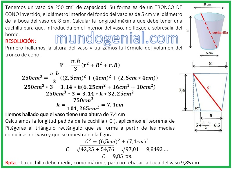 Tenemos un vaso de 250 cm3 de capacidad. Su forma es de un TRONCO DE CONO invertido, el diámetro interior del fondo del vaso es de 5 cm y el diámetro de la boca del vaso de 8 cm. Calcular la longitud máxima que debe tener una cuchilla para que, introducida en el interior del vaso, no llegue a sobresalir del borde.