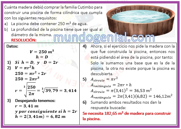 Cuánta madera debió comprar la familia Cutimbo para construir una piscina de forma cilíndrica que cumpla con los siguientes requisitos: A) La piscina debe contener 250 m3 de agua. B) La profundidad de la piscina tiene que ser igual al diámetro de la misma