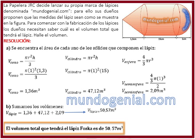 La Papelera JRC decide lanzar su propia marca de lápices denominada “mundogenial.com”: para ello sus dueños proponen que las medidas del lápiz sean como se muestra en la figura. Para comenzar con la fabricación de los lápices los dueños necesitan saber cuál es el volumen total que tendrá el lápiz. Halle el volumen.