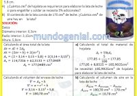Una lata de leche tiene un diámetro interior de 6,3 cm y una altura de 5,8 cm. A) ¿Cuántos cm cuadrados de hojalata se requirieron para elaborar la lata de leche si para engatillar y soldar se necesita 5% adicionales? B) El contenido de la lata consta de 170 cm cúbicos de leche. ¿Cuántos cm cúbicos de aire hay en la lata?