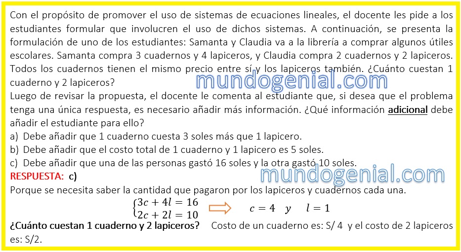 Con el propósito de promover el uso de sistemas de ecuaciones lineales, el docente les pide a los estudiantes formular que involucren el uso de dichos sistemas. A continuación, se presenta la formulación de uno de los estudiantes: Samanta y Claudia va a la librería a comprar algunos útiles escolares. Samanta compra 3 cuadernos y 4 lapiceros, y Claudia compra 2 cuadernos y 2 lapiceros. Todos los cuadernos tienen el mismo precio entre sí y los lapiceros también. ¿Cuánto cuestan 1 cuaderno y 2 lapiceros? Luego de revisar la propuesta, el docente le comenta al estudiante que, si desea que el problema tenga una única respuesta, es necesario añadir más información. ¿Qué información adicional debe añadir el estudiante para ello?