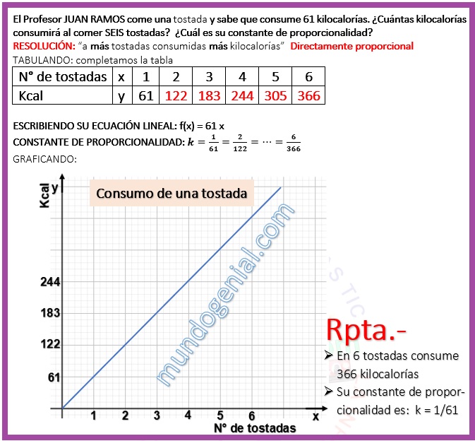 El Profesor Juan Ramos come una tostada y sabe que consume 61 kilocalorías. ¿Cuántas kilocalorías consumirá al comer SEIS tostadas? ¿Cuál es su constante de proporcionalidad? By admin | 17 julio, 2023 0 Comment publicidad