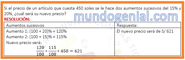 Si el precio de un artículo que cuesta 450 soles se le hace dos aumentos sucesivos del 15% y 20%, ¿cuál será su nuevo precio? By admin | 13 agosto, 2023 0 Comment publicidad