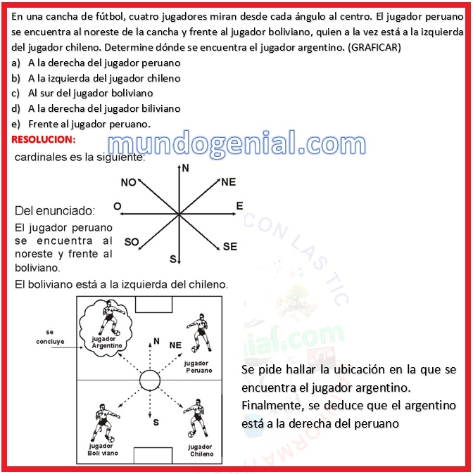 En una cancha de fútbol, cuatro jugadores miran desde cada ángulo al centro. El jugador peruano se encuentra al noreste de la cancha y frente al jugador boliviano, quien a la vez está a la izquierda del jugador chileno. Determine dónde se encuentra el jugador argentino. (GRAFICAR)