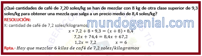 ¿Qué cantidades de café de 7,20 soles/kg se han de mezclar con 8 kg de otra clase superior de 9,3 soles/kg para obtener una mezcla que salga a un precio medio de 8,4 soles/kg? By admin | 20 agosto, 2023 0 Comment publicidad