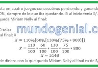 Miriam Nelly apuesta en cuatro juegos consecutivos perdiendo y ganando alternadamente el 25%, 30%, 40% y 10%, siempre de lo que iba quedando. Si al inicio tenía S/ 8000, la cantidad de dinero con la que queda Miriam Nelly al final: