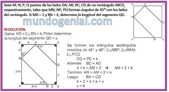 Sean M; N; P; Q puntos de los lados DA; AB; BC; CD de un rectángulo ABCD, respectivamente, tales que MN; NP; PQ forman ángulos de 45^o con los lados del rectángulo. Si MD = 2 y BN = 4, determine la longitud del segmento QD By admin | 20 septiembre, 2023 0 Comment publicidad