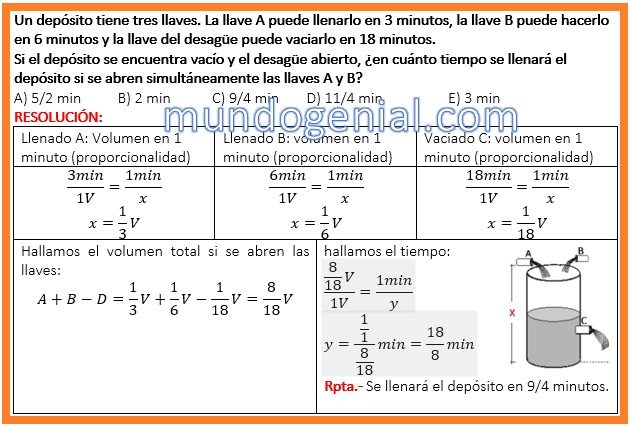 Un depósito tiene tres llaves. La llave A puede llenarlo en 3 minutos, la llave B puede hacerlo en 6 minutos y la llave del desagüe puede vaciarlo en 18 minutos. Si el depósito se encuentra vacío y el desagüe abierto, ¿en cuánto tiempo se llenará el depósito si se abren simultáneamente las llaves A y B?