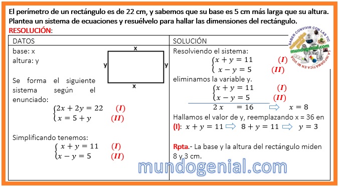 El perímetro de un rectángulo es de 22 cm, y sabemos que su base es 5 cm más larga que su altura. Plantea un sistema de ecuaciones y resuélvelo para hallar las dimensiones del rectángulo. By admin | 26 noviembre, 2023 0 Comment publicidad