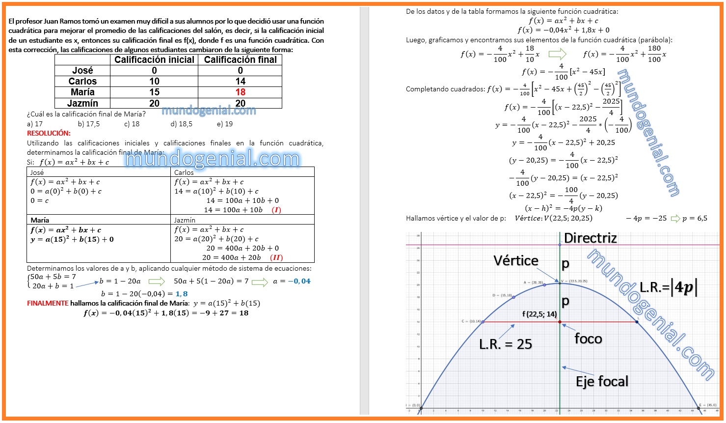 El profesor Juan Ramos tomó un examen muy difícil a sus alumnos por lo que decidió usar una función cuadrática para mejorar el promedio de las calificaciones del salón, es decir, si la calificación inicial de un estudiante es x, entonces su calificación final es f(x), donde f es una función cuadrática. Con esta corrección, las calificaciones de algunos estudiantes cambiaron de la siguiente forma: