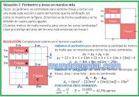 Óscar, un jardinero, es contratado para sembrar fresas y cercar con una malla cada sección o parte del terreno que ha sembrado, tal como se muestra en la figura. El terreno es de forma cuadrada y se ha dividido en cuatro partes iguales. ¿Cuántos metros de malla necesita para cercar las zonas sembradas? ¿Qué porcentaje del área del terreno está sembrado de fresas?