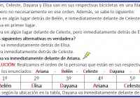Ariana, Belén, Celeste, Dayana y Elisa van en sus respectivas bicicletas en una fila, una detrás de la otra, pero no necesariamente en ese orden. Además, se sabe lo siguiente: •Ariana va en algún lugar detrás de Belén, e inmediatamente delante de Celeste. •Elisa no va en primer lugar. •Dayana va en algún lugar delante de Celeste, pero inmediatamente detrás de Elisa. ¿Cuál de las siguientes alternativas es verdadera? a) Belén va inmediatamente detrás de Elisa. b) Elisa va inmediatamente detrás de Celeste. c) Dayana va inmediatamente delante de Ariana.