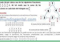 En cada círculo coloca una de las siguientes fracciones: 1/6; 1/3; 1/2; 2/3; 5/6; 1, de tal modo que la suma de las fracciones en cada lado del triángulo sea 2.