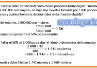 Para hacer un estudio sobre intención de voto en una población formada por 5 millones de votantes, de los cuales 2 900 000 son mujeres, se elige una muestra formada por 3 000 personas. ¿Cuántas mujeres y cuántos hombres deberá haber en la muestra elegida?
